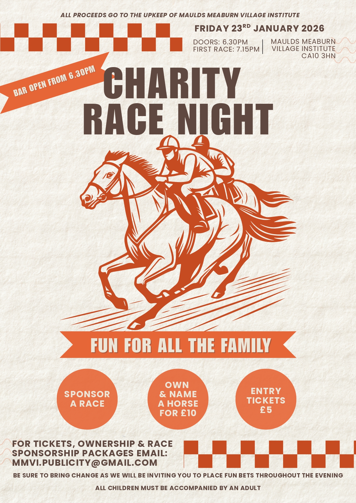 To book an early entry, enquire about sponsoring the event or a race, or own and name a horse, then please contact the MMVI committee on MMVI.publicity@gmail.com or call 07738-686-320 to ensure you don't miss out. Tickets will also be available at the door on the night.